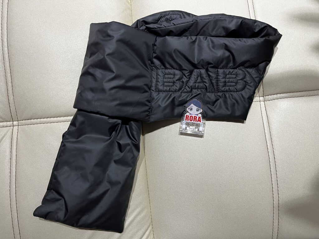 - ブラックのダウンタイプのマフラー:軽くて保温性あり。モノトーンコーデに合わせやすい実用品。